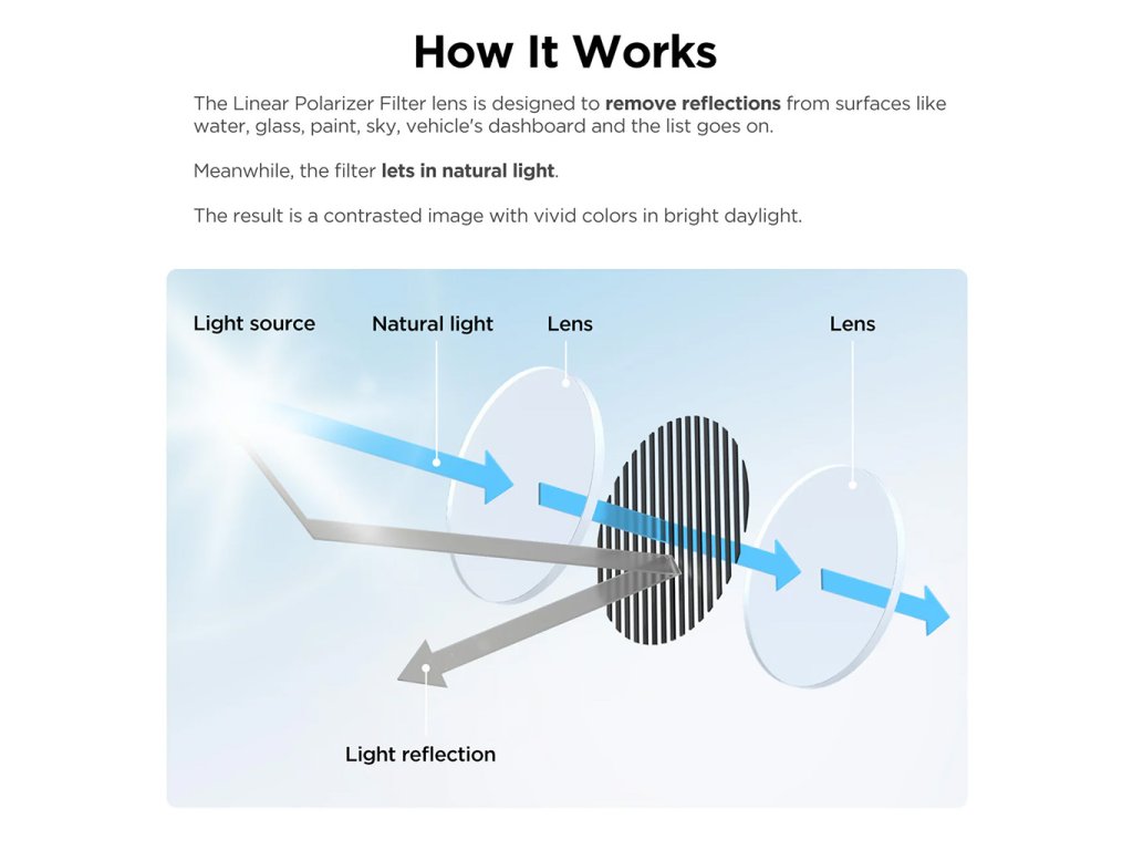 CPL polarizační filtr (Circular Polarizing Lens) se používá pro potlačení nebo odstranění odlesků z nekovových povrchů jako je voda, sklo a podobně, které by jinak mohly zhoršit kvalitu obrazu. Filtr zároveň mírně projasňuje barvy a dokáže celkově vylepšit kontrast obrazu. Je to ideální filtr pro natáčení skrz sklo a pro snížení odlesků od palubní desky nebo od silnice.