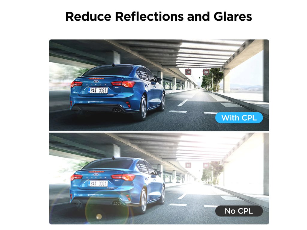 - Redukce odlesků: CPL filtr pomáhá minimalizovat odlesky od čelního skla, palubní desky a dalších lesklých povrchů, čímž zajišťuje čistší a jasnější záznamy
