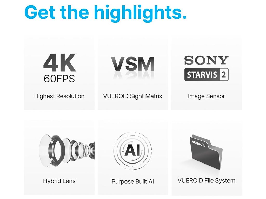 - Vlastní ISP technologie VUEROID Vueroid si neladí obraz „od oka“ – díky vlastnímu ISP (Image Signal Processing) dolaďuje až 18 parametrů (jas, ostrost, redukce šumu atd.), takže dostaneš velmi vyvážený obraz bez přepalů a přehnané mazanice komprese.