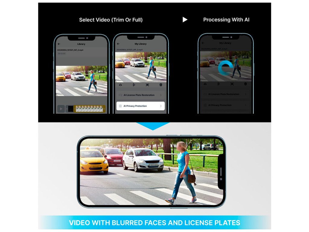 - Funkce AI Privacy Protection – automatické rozostření tváří řidiče, chodců nebo SPZ pro váš klid a bezpečí.