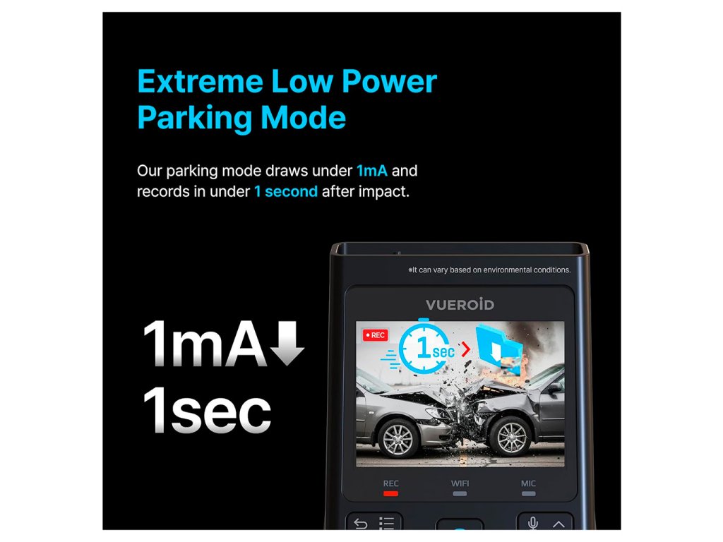 - Funkce Extreme Low Power Mode – pokud je vozidlo zaparkováno, kamera přejde do nízkospotřebního stavu a spustí záznam pouze při nárazu či pohybu.